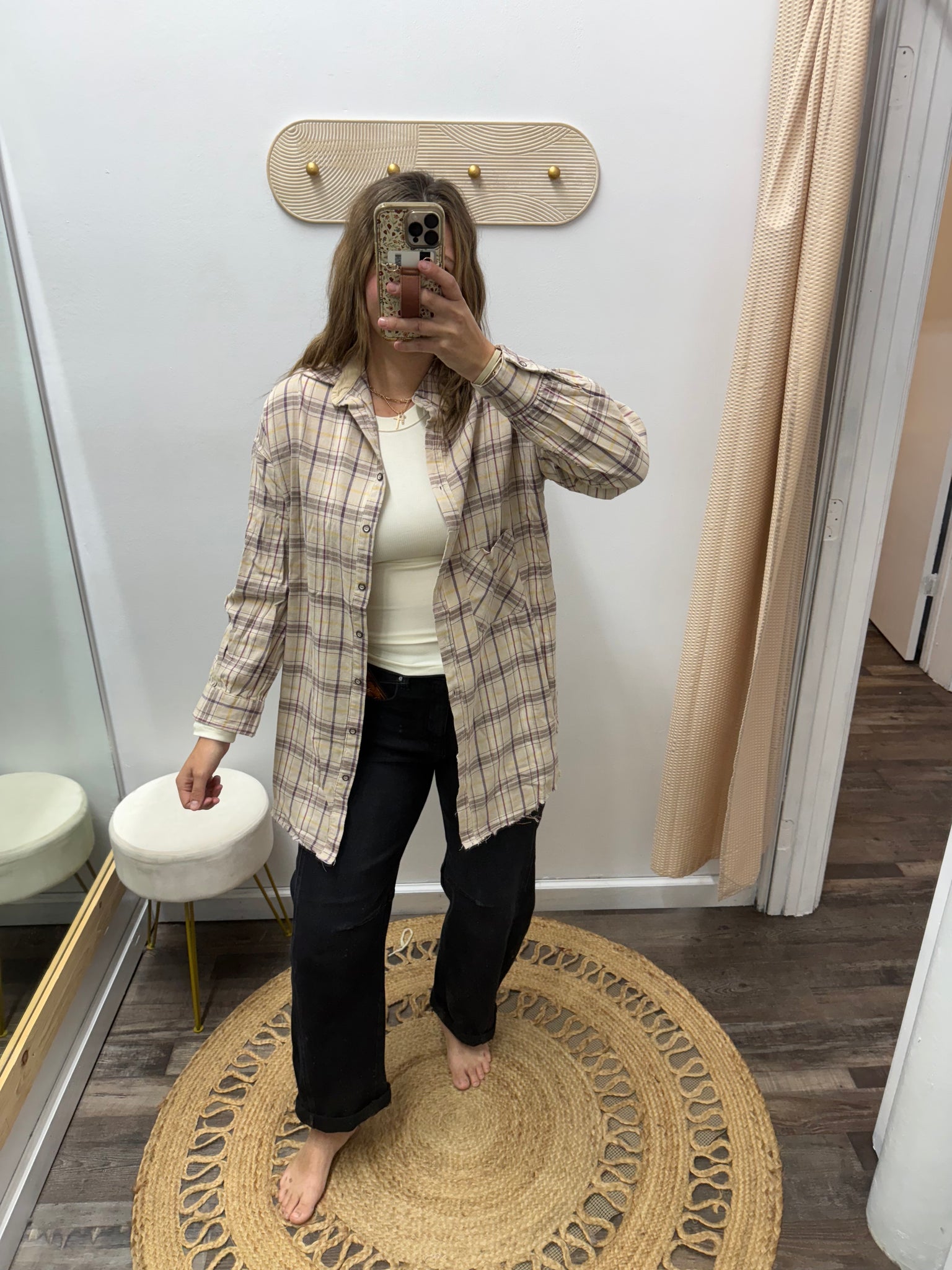 BUTTON UP PLAID SHIRT DRESS FEATURES BREAST POCKETS AND BUTTON CLOSURE ON CUFFS. Model is in a size small