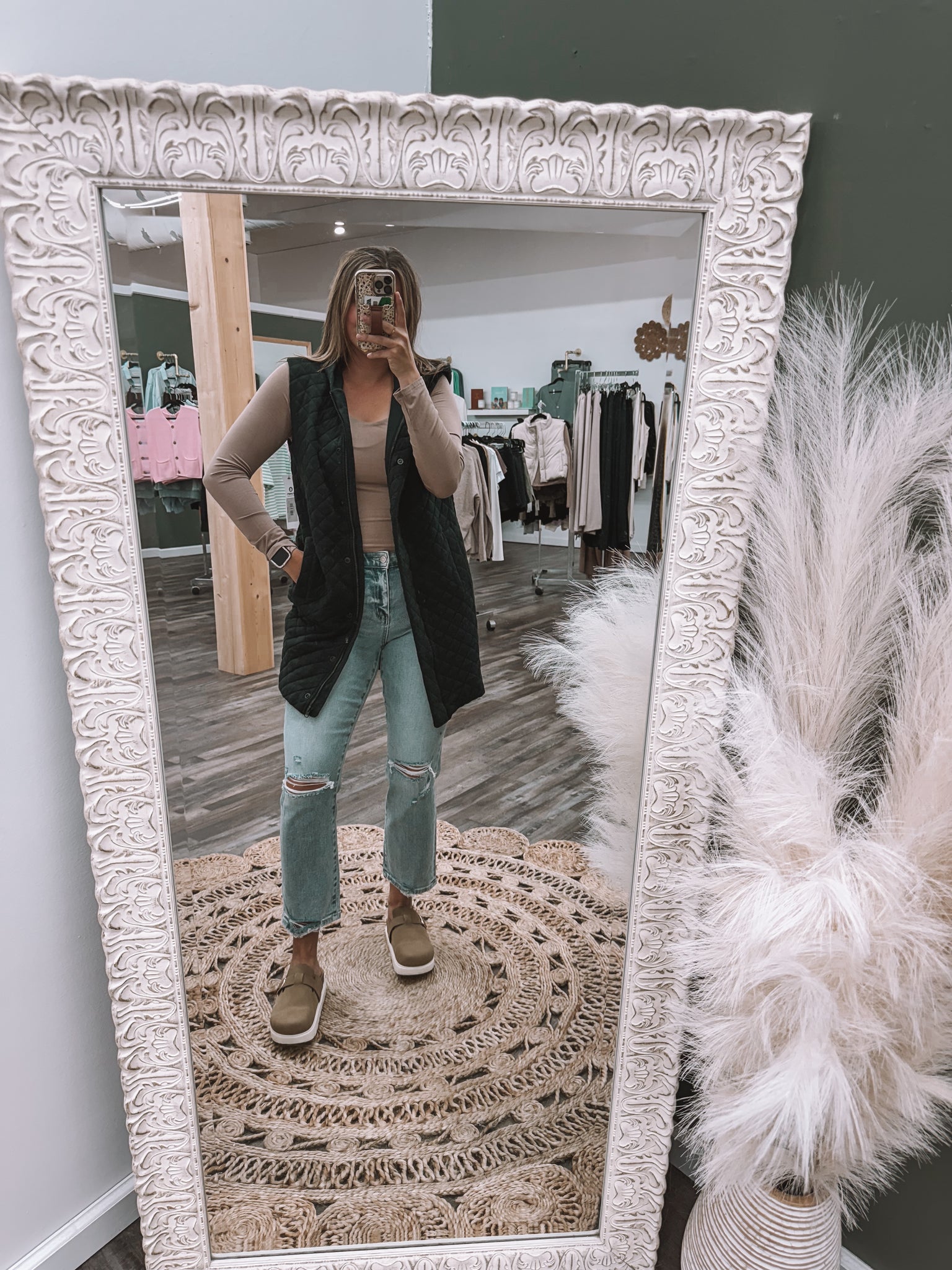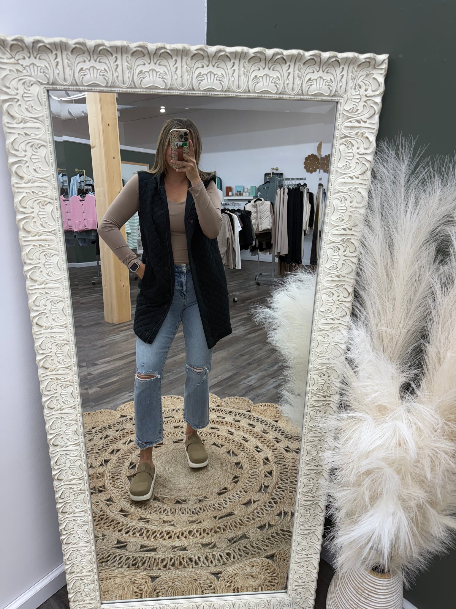 Discover ultimate comfort and style with our insulated quilted jersey vest. Embrace the soft, stretchy warmth of the longline vest, complete with tailored welt pockets and hidden snap placket at the hip for enhanced movement. Featuring a full front zip and lightweight, fully lined jersey for your perfect ensemble