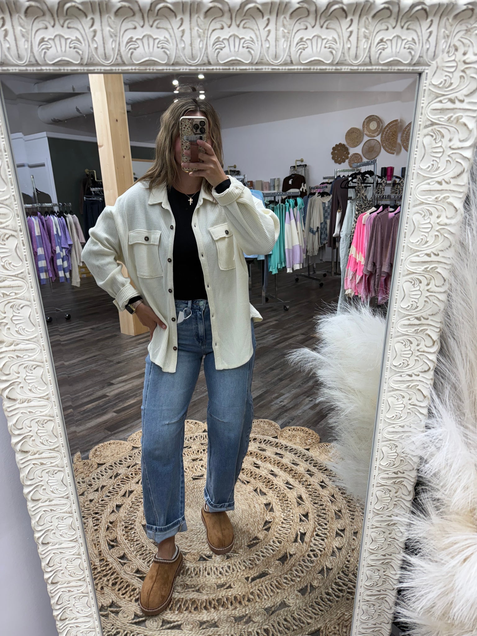 This mineral-washed oversized waffle knit shacket bringse a trndy, laid-back vibe with its roomy fit. The oversized design makes it perfect for easy layering, whether you're heading out or keeping it casual. Style over a tee with jeans for an effortlessly cool look