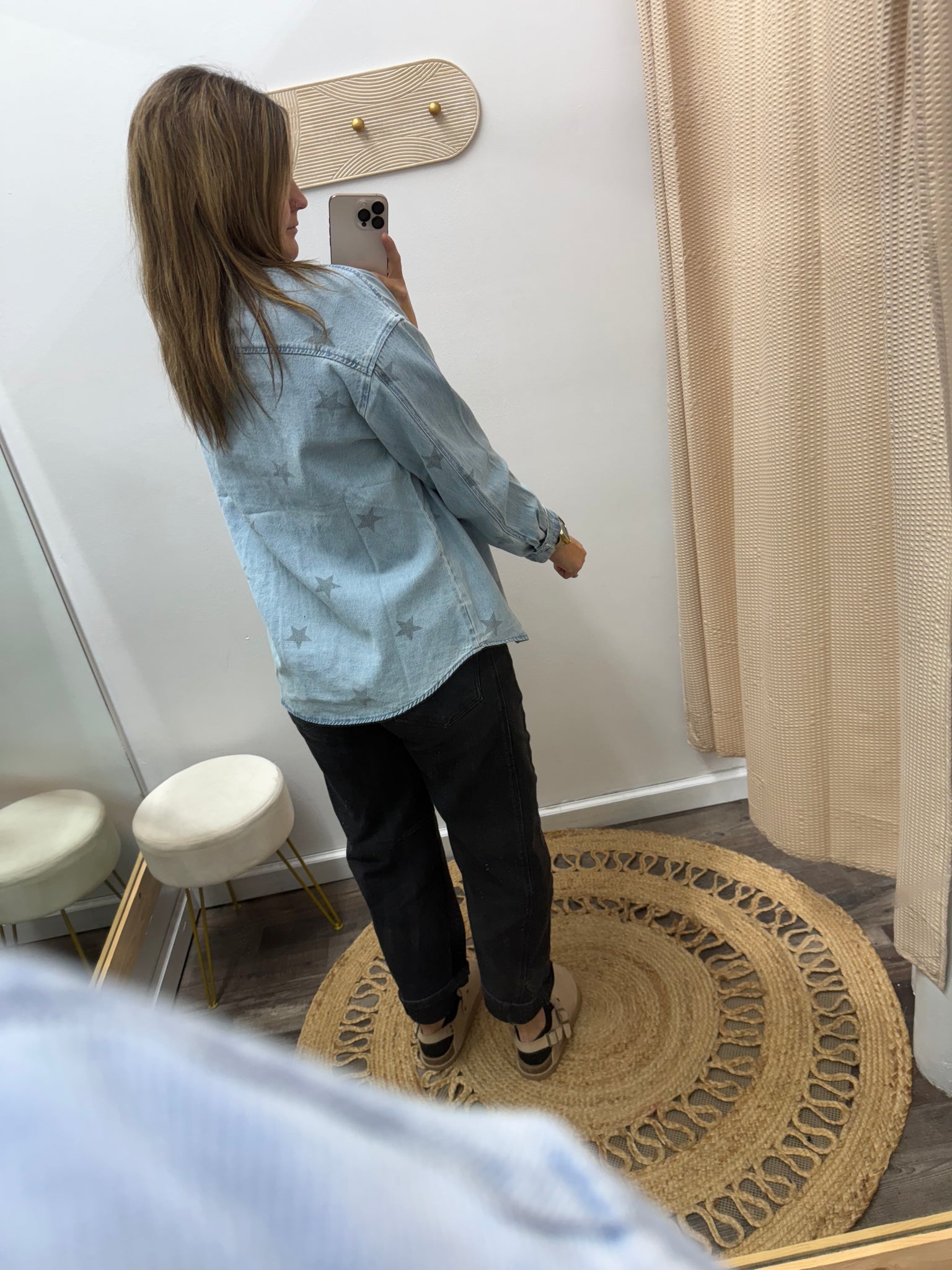 OVERSIZED STAR PRINT SHIRT - Length 29" | 1/2 Chest(1" below armhole) 23" in size S - Model Info: Height 5'8" | Waist 24" | Hips 34