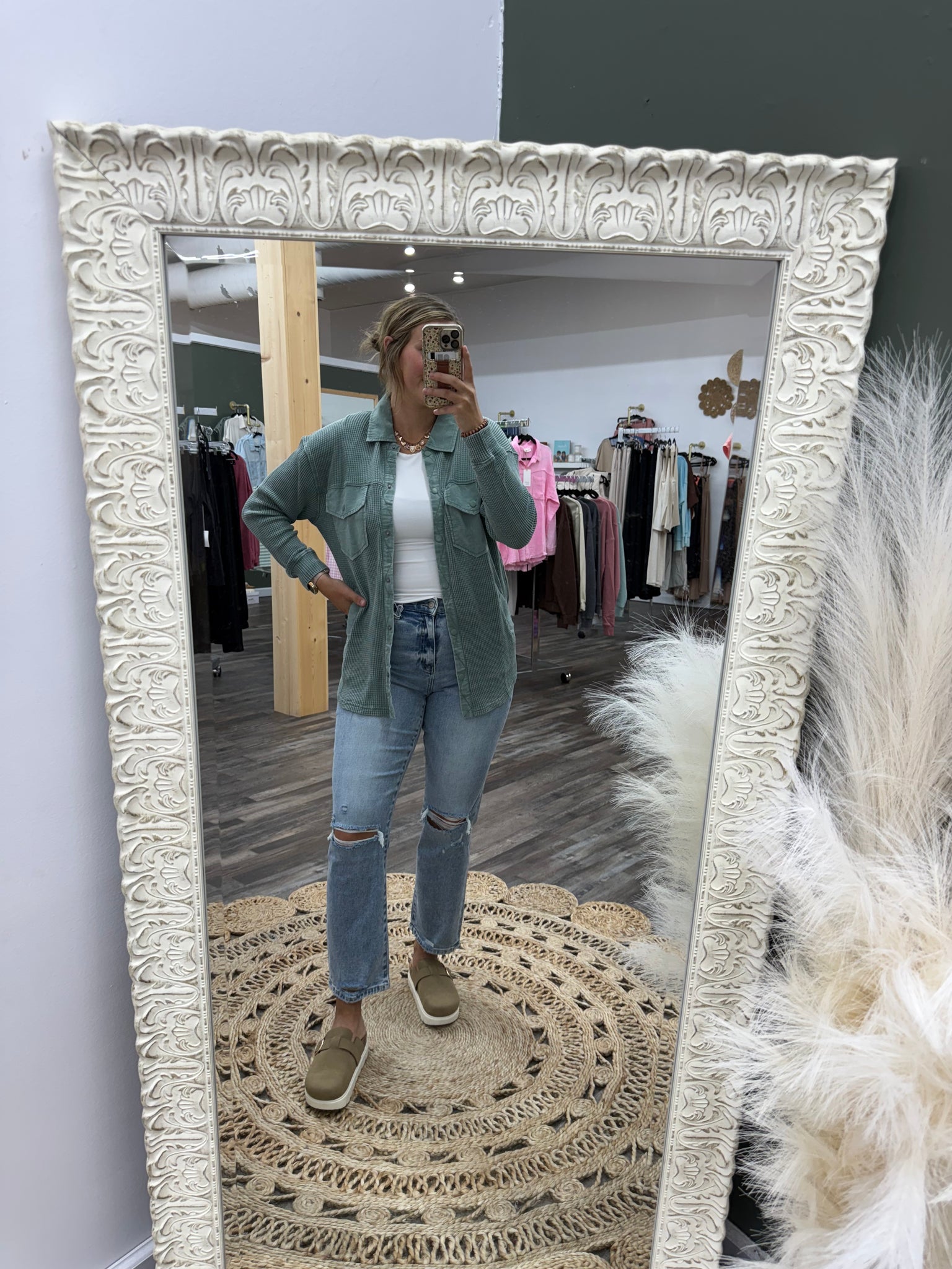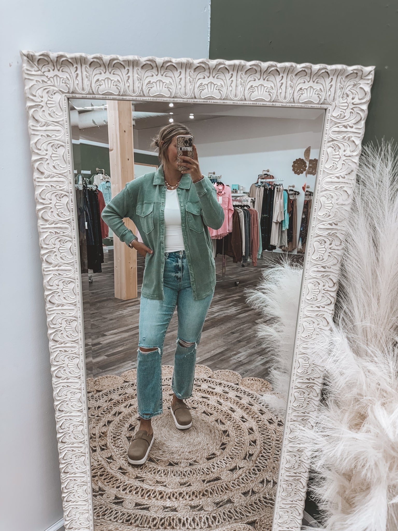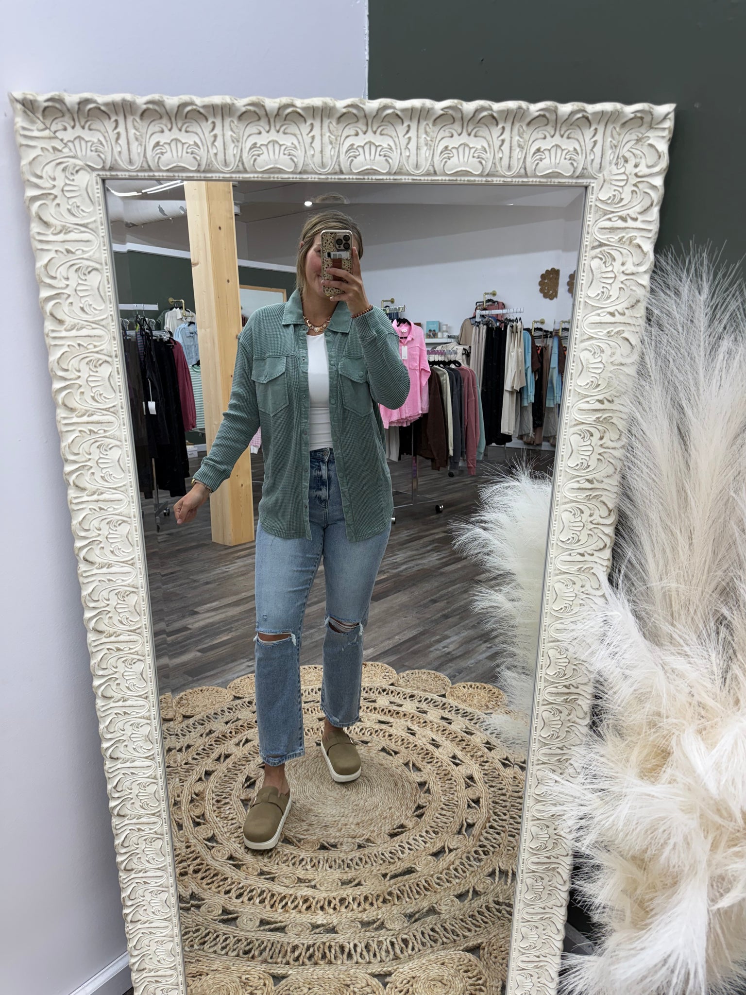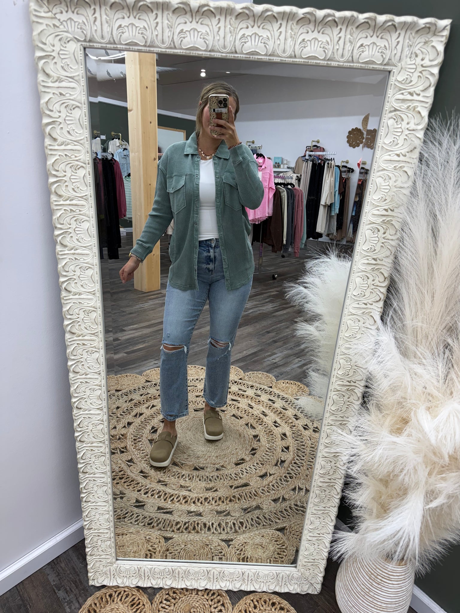 model in small : Be effortlessly cool in this mineral-washed jacket. It features a waffle knit design, snap button closures on the front that led into a pointed collar, two chest patch pockets with snap button closures, side pockets, a slight curved hem, and drop sleeve for relaxed fit.