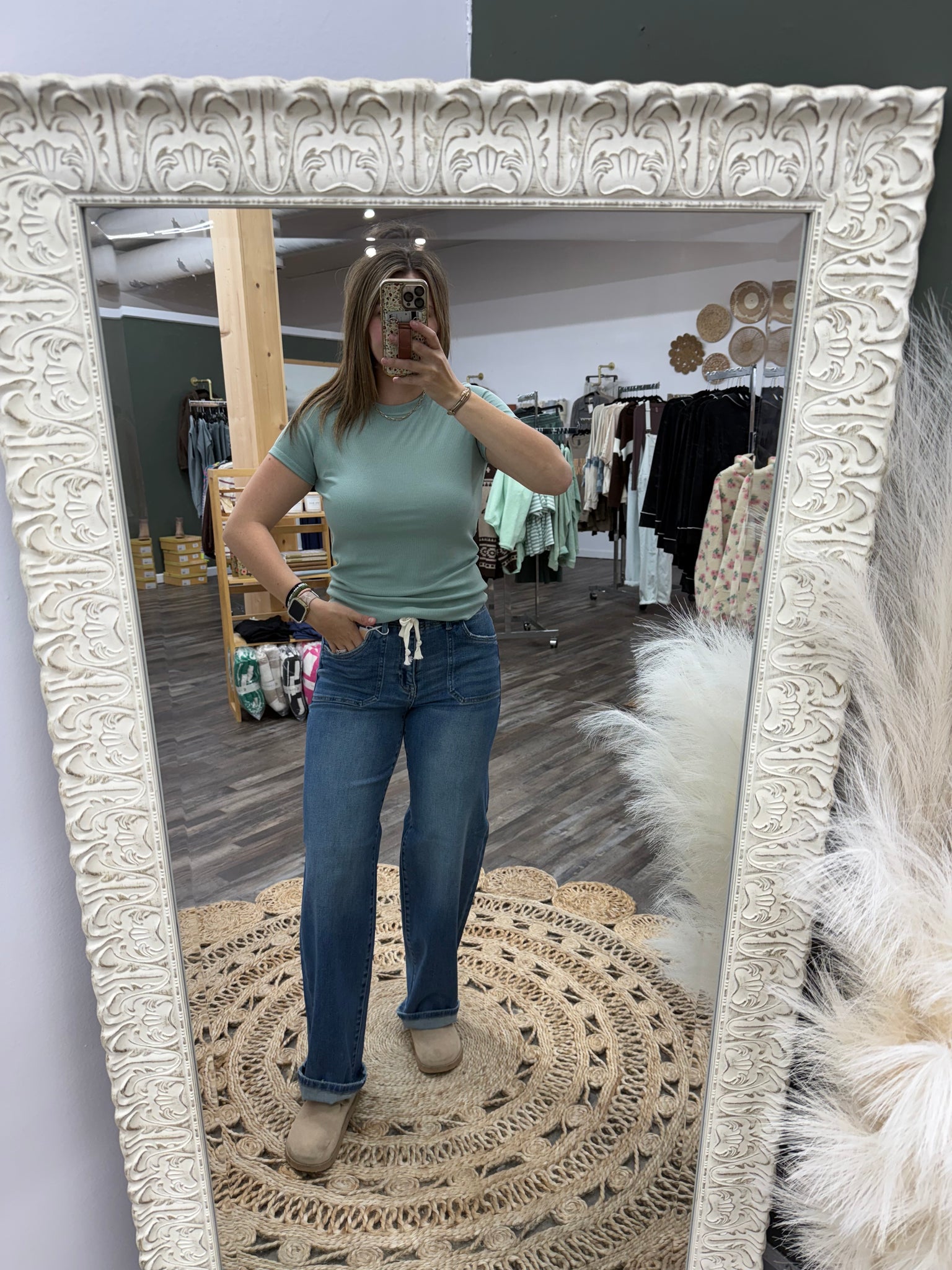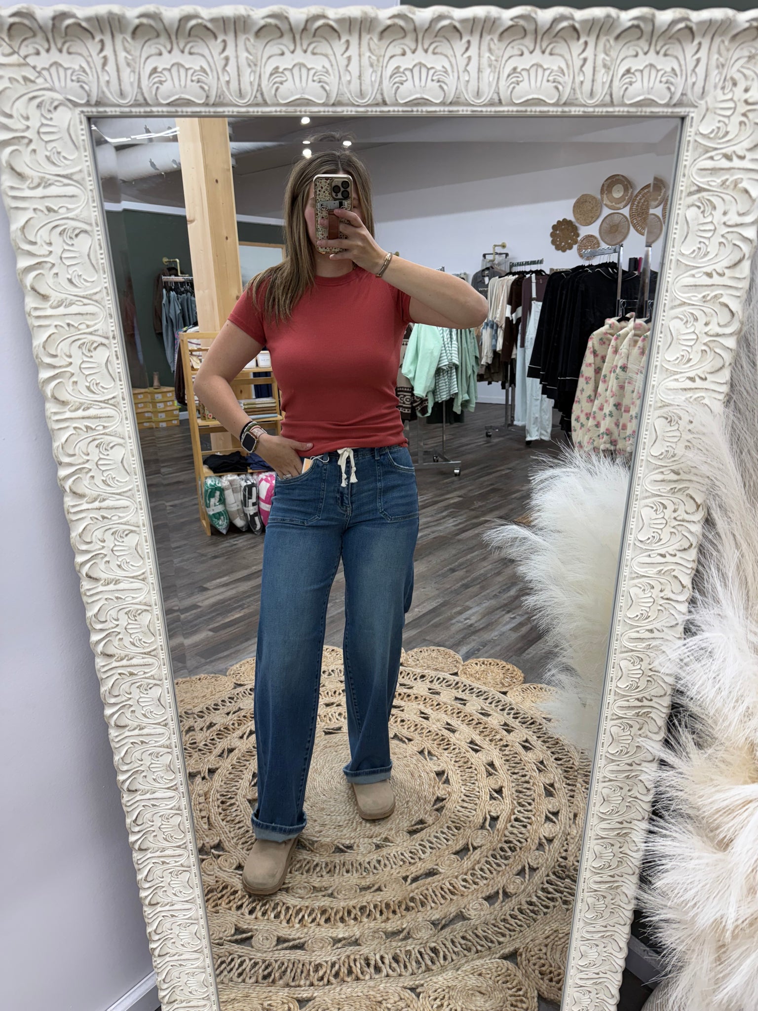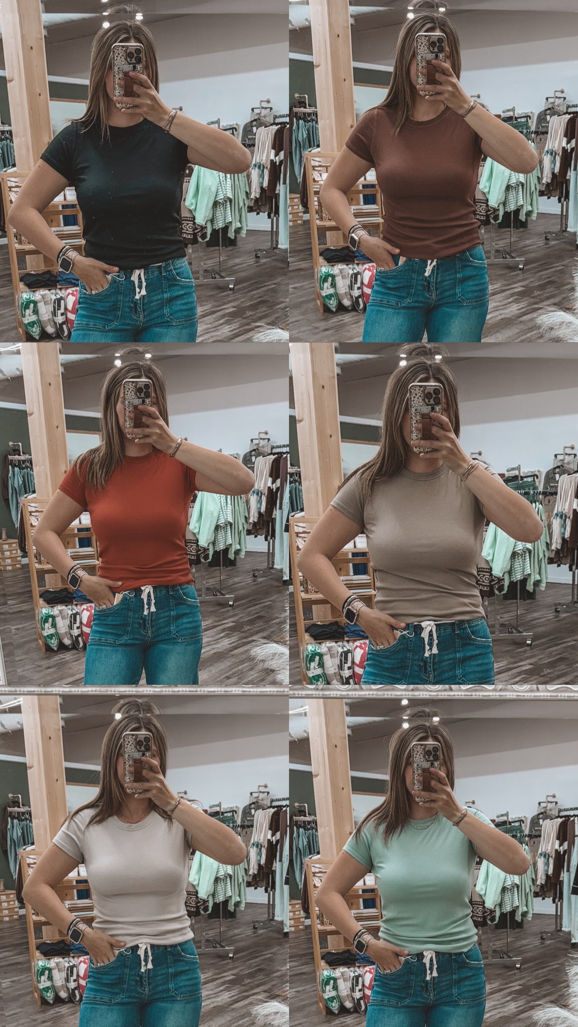 RIBBED KNIT BASIC T-SHIRT 65% RAYON, 3% POLYESTER, 5% SPANDEX