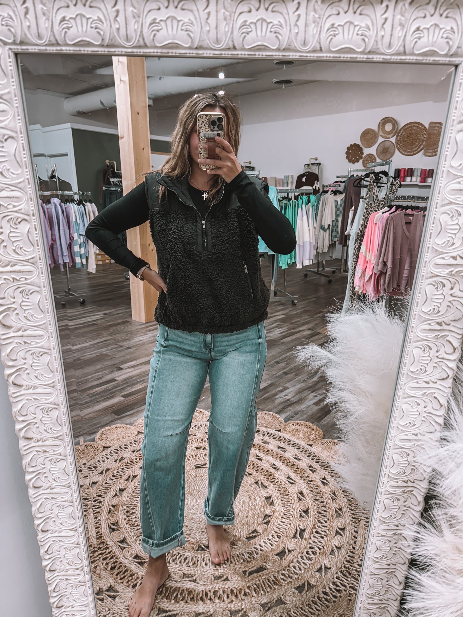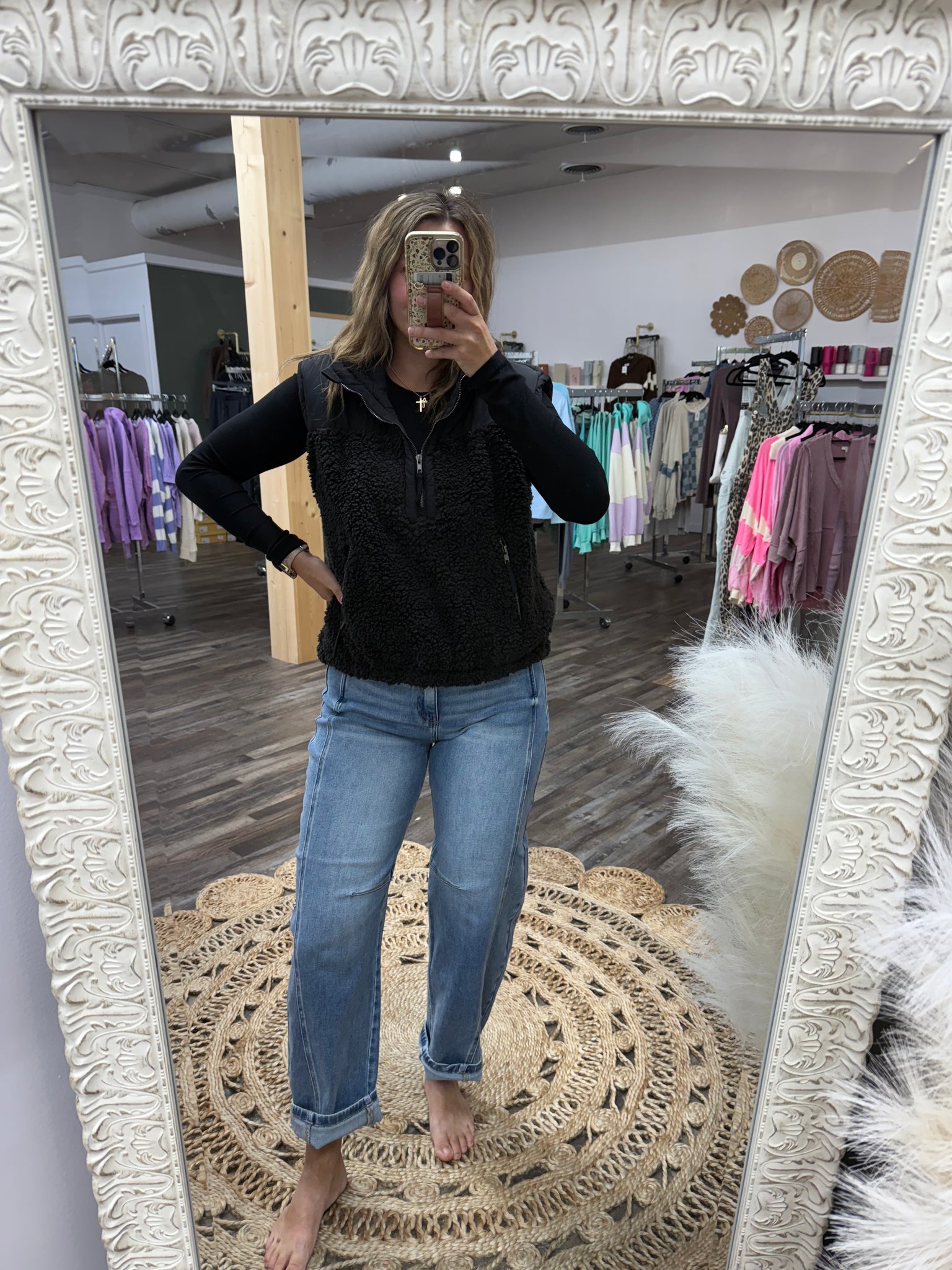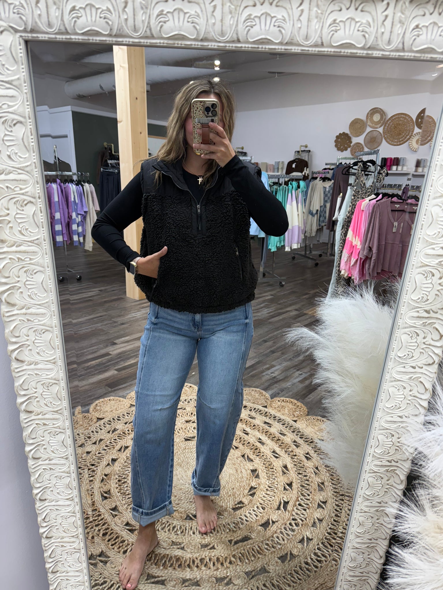 Sporty, outdoor-inspired style to your look with this cozy pullover vest. It features a unique mixed-media design, combining a plush, sherpa fleece body with a smooth, nylon yoke and a protective high stand collar. The practical half-zip closure allows for easy wear, and a side pockets offers a convenient place to warm your hands. This versatile vest is the perfect layering piece for fall adventures, easily worn over your favorite long-sleeve tops.