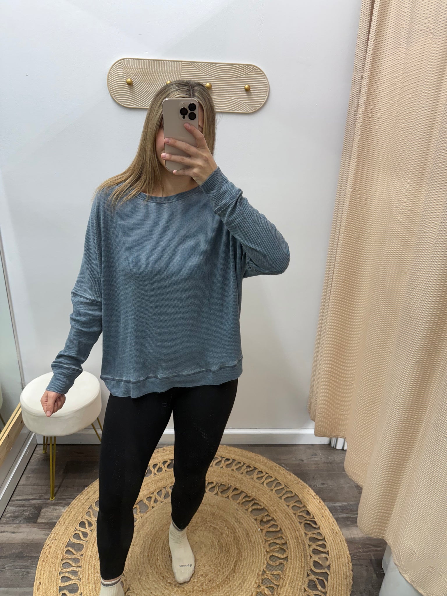 This slouchy pullover exudes casual vibes, and it is super versatile. It features rounded neck and long sleeves (with seams wrapping around the elbow). The nature of the mineral wash on the garment allows for a unique and individual finish each time. One size. Our model typically wears sample size S. 60% cotton, 40% polyester. Mineral wash